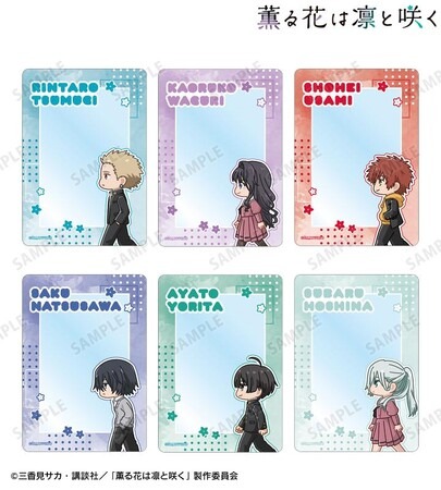 紬 凛太郎、和栗薫子、宇佐美翔平、夏沢 朔、依田絢斗、保科 昴が歩いているちびキャラを新たに描き起こし、花のモチーフをあしらったアクリルスタンド付きコースターに仕上げました。