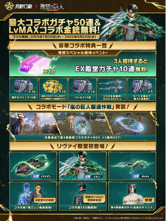 さらに、金枠銃器「SACR-L:新型立体機動装置」や「AUG:新型立体機動装置」も新たな特性とともに再登場。コラボアイテム「返り血勲章・リヴァイ」「スキン:進撃の巨人」「セダン 決意者:エレン・希望」も復刻します。第4弾のコラボガチャアイテムを獲得できるのは今回が最後のチャンス!この機会をお見逃しなく!