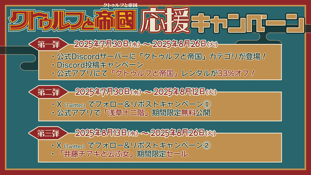 キャンペーン第一弾として、キャンペーン期間を通してDiscordに「クトゥルフと帝国」カテゴリが登場。「クトゥルフと帝国」の魅力を紹介するチャンネルや、仲間を探すためのスレッドなどを追加いたします。また、スレッドに投稿することで「クトゥルフと帝国」書籍や公式アプリクーポンが当たるキャンペーンを開催するほか、公式アプリでの「クトゥルフと帝国」レンタルが33%オフになります。