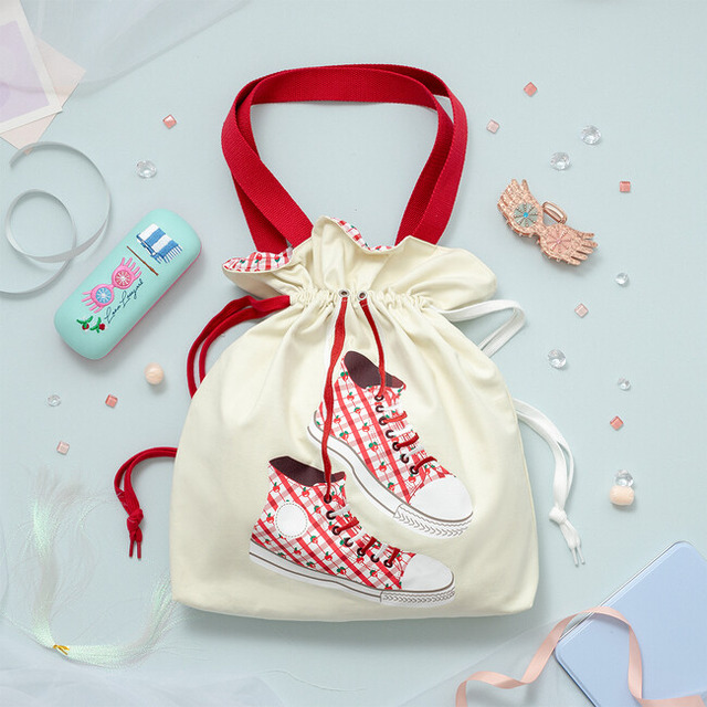 巾着型のトートバッグは、映画『ハリー・ポッターと不死鳥の騎士団』の作中に登場するルーナのスニーカーのデザイン部分を刺繍やラバープリントなど、さまざまな仕様を組み合わせて表現しています。巾着を絞って紐を蝶々結びにするとスニーカーの紐を縛っているように見えるユニークな仕様や、内側の総柄デザインなど、細部までこだわりの詰まったアイテムです。