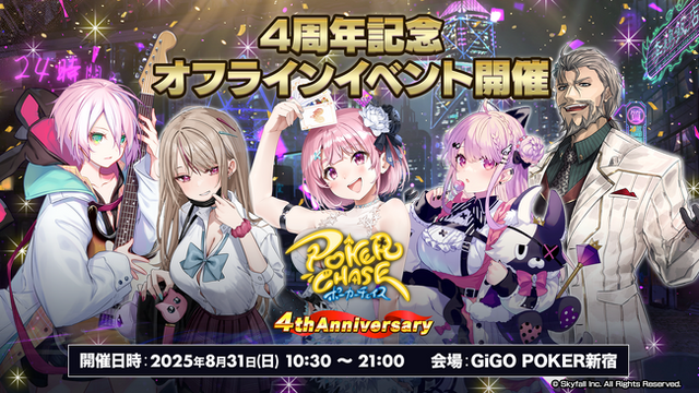 株式会社Skyfall(東京都港区、代表取締役社長:長谷川 智一、以下Skyfall)が運営するバトロワ式オンラインポーカーゲーム『ポーカーチェイス』は、株式会社GENDA GiGO Entertainment(本社:東京都港区 代表取締役社長:二宮 一浩)が運営する「GiGO POKER新宿」と共催するオフラインイベント「Poker Chase Tournament in GiGO POKER新宿 ~4th Anniversary~」を、2025年8月31日(日)に開催することが決定しました。