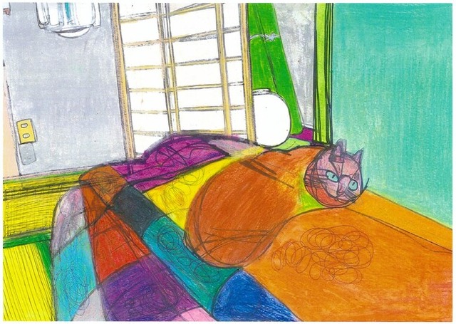 背景はダイナミックに力強く、布団の上のねこはやわらかくもっちりしたタッチで描いてみました。