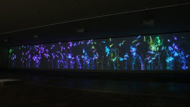 本作品は、人と郵便の関係を虫媒花と虫たちの生態関係に重ね合わせた、リアルタイム生成される人工生態系シミュレーションです。AxCROSSの特徴である全長約18mの大型スクリーンを最大限に活用し、来館者が等身大で体験できるインタラクティブな表現空間を創出します。