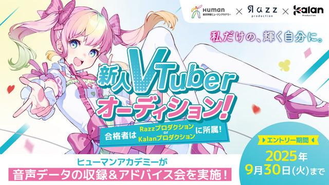 教育事業を展開するヒューマンアカデミー株式会社(本社:東京都新宿区、代表取締役:今堀健治、以下「当社」)の全日制専門校 総合学園ヒューマンアカデミー(以下「当学園」)は、大手Vtuber・Vライバー事務所「Razzプロダクション」と、新進気鋭の男性VTuber ・Vライバー専門事務所「Kalanプロダクション」との共同開催による「新人VTuberオーディション」を開催し、2025年9月30日(火)までエントリーを受付いたします。