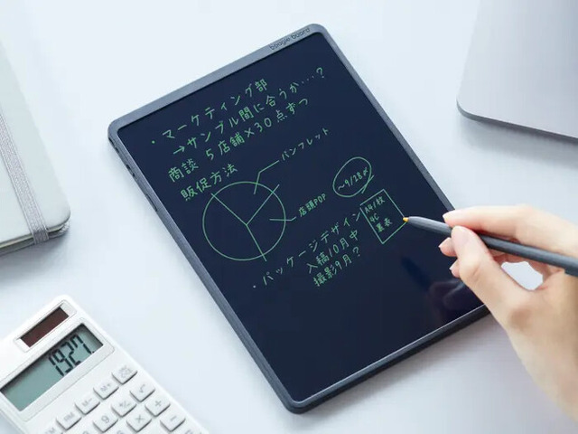 「ブギーボード」BB-20は、機能とデザイン性をより高めた約8.5インチモデルです。フレームを可能な限り細くし、消去ボタンを表面ではなく側面に設計したことで、書き込みスペースを広く使えます。