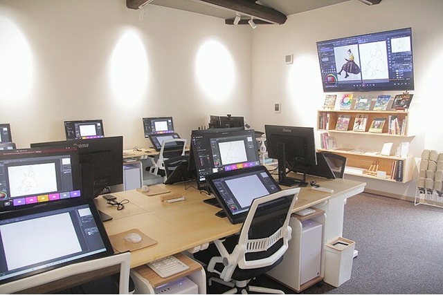 教室にはデジタル絵画に必要な PC・ソフト・ペンタブレットなどすべて完備。受講者は手ぶらで通えて、初心者からプロまで、自分のレベルに合わせて学べる 3 つのクラス(エントリー/スタンダード/マスター)があり、講評・自習時間も完備されている。