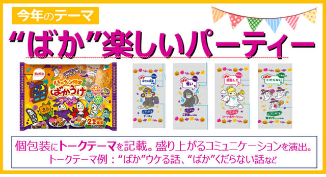 パッケージはハロウィン仕様で“ばかうけ”キャラクターが大変身。みんなに配るのに便利な個包装タイプ。カラフルな個包装には全部で21種類のトークテーマを記載しました。