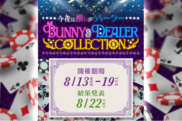 今回のテーマは「バニーガール&ディーラー」。クールなディーラー姿、キュートでセクシーなバニーコスチューム…とびきりの”勝負服コンテンツ”でファンを魅了します。あなたらしい魅せ方でファンのハートを高配当でGETし、ランキング上位を目指すランキングイベントです。