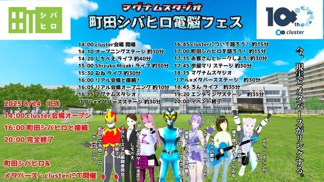 国内最大級のメタバースプラットフォーム「cluster」を運営するクラスター株式会社(本社:東京都品川区、代表取締役CEO:加藤直人、以下「クラスター」)は、一般社団法人町田市観光コンベンション協会(東京都町田市、会長:杉浦隆)と協力し、同協会が管理運営を行う施設、町田シバヒロ(東京都町田市中町、以下シバヒロ)の開園10周年を記念して2025年3月にオープンした「バーチャル町田シバヒロ」にて、第2弾となるイベント「町田シバヒロ電脳フェス」を2025年8月24日(日)に開催することをお知らせいたします。