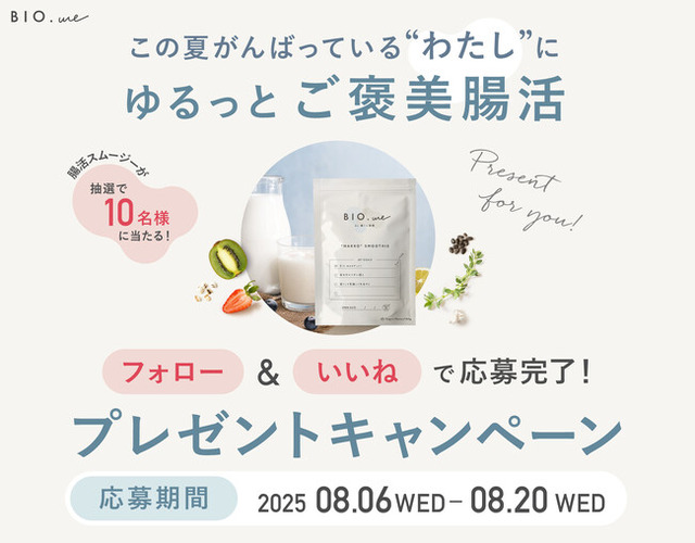夏本番を迎え、「薄着になる季節に向けてダイエットをしたい」と考えている方は多いものの、厳しい食事制限や過度な運動はなかなか続きません。また、夏休みは家族のことに時間を取られ、自分のケアは後回しになりがちです。「BIO.me」は、そんな頑張りすぎない、自分らしいダイエットを応援します。食事を無理に減らすのではなく、いつもの朝に1杯プラスするだけで、手軽に腸内環境を整え、内側からキレイをサポート。このキャンペーンを通して、心と体が喜ぶ“ゆる腸活”という新しいダイエット習慣を体験していただきたいと考えています。