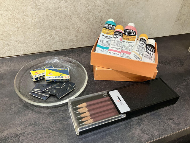 柳原画伯のご遺族および所蔵者である株式会社美術著作権センターのご協力をいただき、柳原画伯が実際に使用していた鉛筆やアクリル絵の具等の私物の画材道具を、以下の2店舗にて展示いたします。