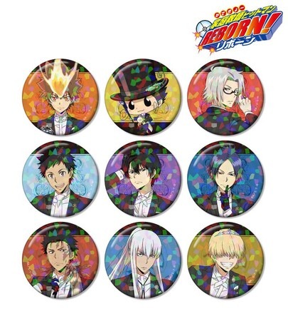 沢田 綱吉、リボーン、獄寺 隼人、山本 武、雲雀 恭弥、六道 骸、XANXUS、スペルビ・スクアーロの描き下ろしイラストをグリッター加工を施した缶バッジに仕上げました。
