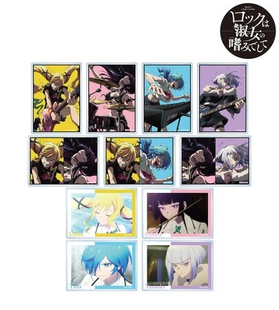 鈴ノ宮りりさ、黒鉄音羽、院瀬見ティナ、白矢環のイラストと印象的なシーンをアクリルカードに仕上げました。