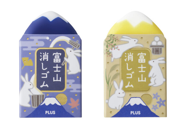 今回は、“お月見”をテーマに、消しゴムケースにうさぎや月をレイアウトした「夜富士」と「月富士」の2柄(2色)の富士山消しゴムを、お月見だんごに見立てた小箱に収めました。消しゴムの樹脂色は、秋の風情漂う新色の群青色と山吹色。インバウンド向けのプレゼントやお土産にもおすすめです。メーカー希望小売価格は638円(税込)です。