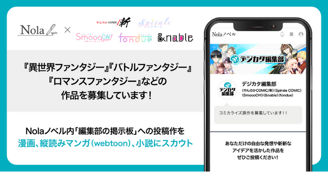 60万人を超える作家の皆さまが登録する創作プラットフォーム「Nola(ノラ)※1」を提供する株式会社indent(本社:東京都千代田区、代表取締役社長:釜形 勇気、以下「indent」)は、デジタルコンテンツの販売、制作、海外版権仲介を行っているデジタルカタパルト株式会社(本社:東京都文京区、代表取締役:西山 毅彦、以下「デジタルカタパルト」)は、2025年8月7日(木)より、indentが運営する小説投稿サイト「Nolaノベル」内『編集部の掲示板』に、<デジカタ編集部>から全5レーベル分(やんのかCOMIC/斬、Spirale COMIC、SmoooCH!、&nable、fondue)のページを開設し、それぞれのレーベルにおいてコミカライズ原作の募集を開始いたしますことをお知らせいたします。