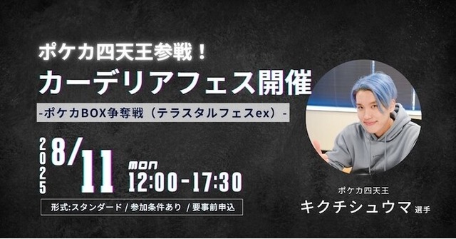 本イベントでは、ポケモンカードゲーム界のトッププレイヤーとして知られるキクチシュウマ(コンソメ)選手をゲストに迎え、参加者の皆様と共に白熱のバトルを繰り広げます。キクチシュウマ選手はポケカ四天王としても活躍されています。