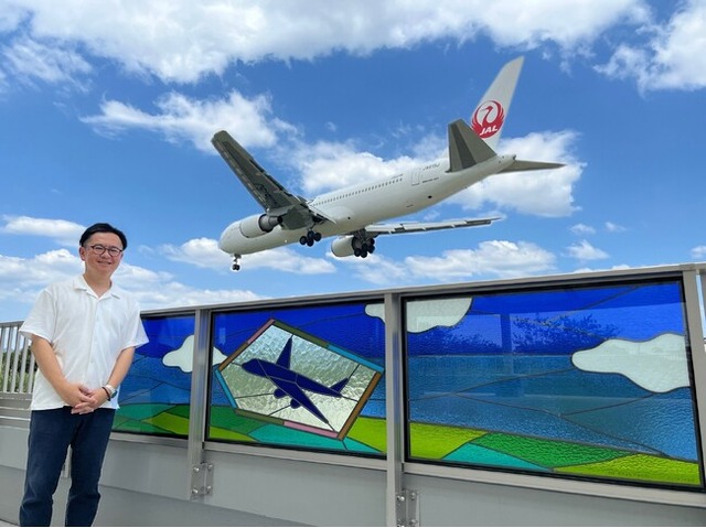 寄贈作品は、幅約3.0mの大型ステンドグラスパネルで、2027年春に全面開園する豊中つばさ公園の未来像をモチーフにしており、大空を飛ぶ飛行機を描いたデザインです。自然光とともに色彩が変化し、背後には本物の飛行機が降下する姿が映り込むという、全国的にも珍しい視覚体験を提供します。