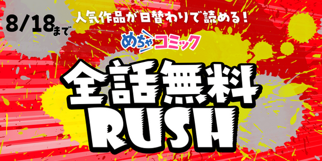 株式会社アムタス(東京都港区 代表取締役社長 児玉隆志) は電子コミック配信サービス「めちゃコミック(めちゃコミ)」において、日替わりで様々な人気作品が24時間だけ全話無料で読める「全話無料RUSH」キャンペーンを8月8日(金)10:00 ~ 8月18日(月)09:59の期間にて開催いたします。