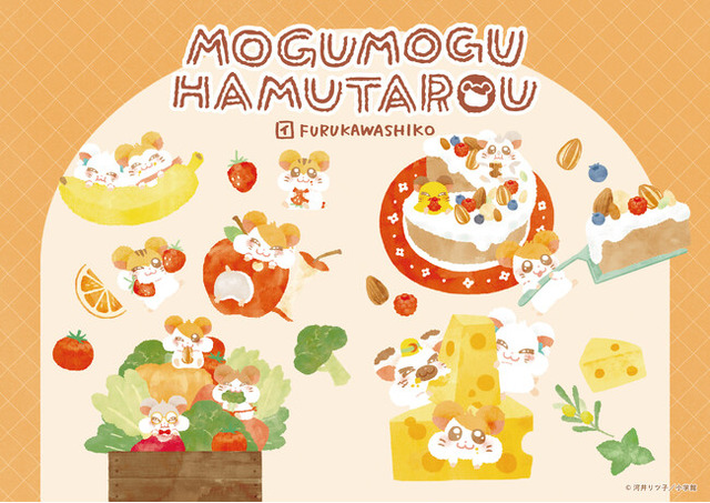 ハム太郎たちがフルーツや野菜、チーズやケーキを幸せそうに”もぐもぐ”食べる姿にほっこり癒される古川紙工描きおこしのデザインです!