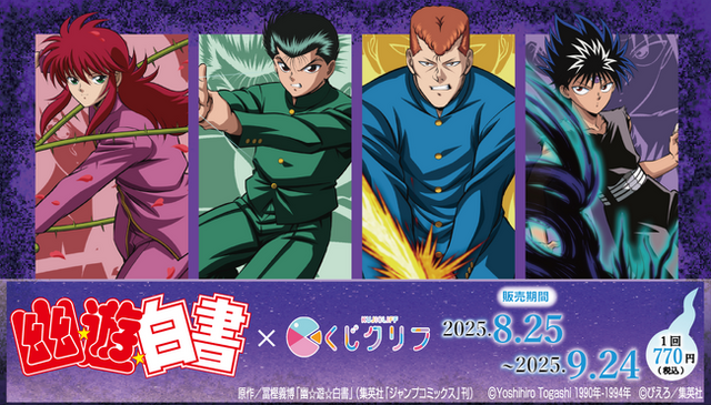 株式会社サトクリフ(本社:東京都千代田区 代表取締役社長:加藤 勝)は、運営するオンラインくじサービス「くじクリフ」よりTVアニメ『幽☆遊☆白書』オンラインくじを、2025年8月25日(月)10時より販売します。