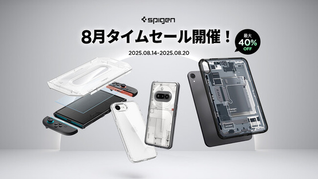 モバイルアクセサリーブランド<Spigen(シュピゲン)>は、日頃のご愛顧への感謝を込めて、最大40%OFFの『8月タイムセール』を8月14日(水)から8月20日(火)まで開催します。
