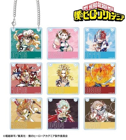 緑谷出久、爆豪勝己、飯田天哉、上鳴電気、耳郎響香、ミルコ、荼毘、レディ・ナガンのビジュアルを新たなタッチで魅力的に表現し、アクリルのドアプレート風チャームに仕上げました。20cmのチェーンが付属しております。