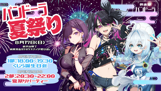 株式会社PANDORA(本社東京都渋谷区、代表取締役:宮瀬卓也/和泉義博)は8月17日(日)に所属タレントの咲田ゆな/夏乃音ユキ、橘舞/夷振えの、霜月めあ/音零くじら が登場するイベント『パンドーラ夏祭り』を開催します。