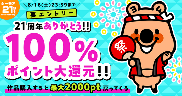 21周年を記念し、日頃の感謝を込めて「21周年ありがとう!!100%大還元」や「くじ引きで最大99%OFFクーポンプレゼント」を実施いたします。また通常よりも5倍特典ポイントがもらえるキャンペーンも実施します。お得なこの機会に思う存分マンガをお楽しみください!