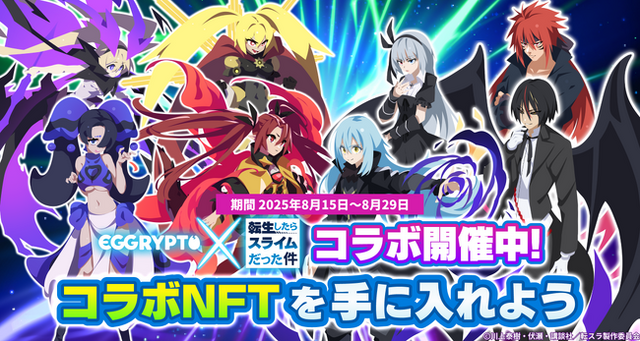 株式会社GameWith(本社:東京都港区、代表取締役社長:今泉卓也、以下「GameWith」)は、出資先であり事業パートナーである株式会社Kyuzan(本社:東京都渋谷区、代表取締役:高橋 卓巳、以下「Kyuzan」)と共同開発した、アプリで簡単に遊べるNFTゲーム「EGGRYPTO(エグリプト)」において、今回で2回目となるアニメ「転生したらスライムだった件」とのコラボイベントを本日8月15日(金)12時より開催いたします。