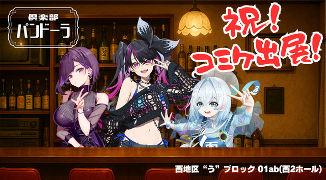 今回のコミックマーケットに合わせて、XTuberメンバーがお届けする新作オリジナルドラマCD「倶楽部パンドーラ」(ランダムチェキ1枚付先着100名)の第0話を最速販売致します。ブースでは、Vキャラにコスプレしたメンバーに会えるかも!?