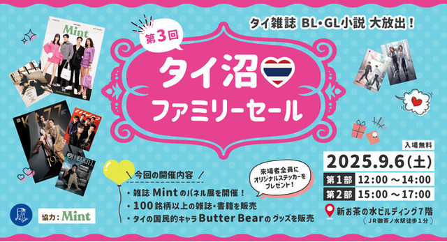 日販アイ・ピー・エス株式会社(本社:東京都文京区、代表取締役社長:佐藤 弘志)の企画・運営する、海外雑誌や海外書籍などを中心に常時約3000点の紙出版物を取り扱う個人向けのECサイト「世界とつながる本屋さん Bookbird」( https://store.shopping.yahoo.co.jp/nippanips/ )は、タイ俳優表紙雑誌やタイBL・GLドラマ小説が最大半額となる『第3回タイ沼ファミリーセール』を、2025年9月6日(土)に御茶ノ水にて開催します。