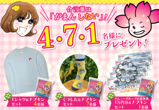 「はなちゃん@チムニー宣伝部」と「ホップ☆ステップ きとみちゃん」のXアカウントまたはInstagramアカウントをフォローすることでキャンペーンに参加可能。ご参加いただいた方の中から、それぞれ抽選で12名様に「ホップ☆ステップ きとみちゃんオリジナルグッズ」や「チムニーグループお食事券」をオリジナル生理用ナプキンとセットでプレゼントいたします。