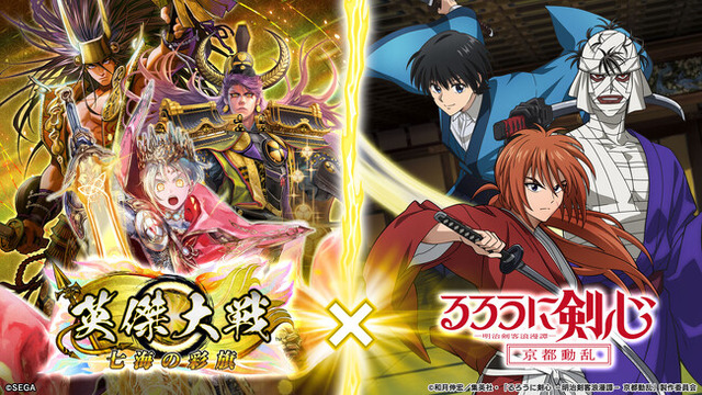 株式会社セガ フェイブ(本社:東京都品川区、代表取締役社長執行役員:杉野行雄)は、現在稼働中のアミューズメント施設向け対戦型カードアクションゲーム『英傑大戦 七海の彩旗(以下、英傑大戦)』において、TVアニメ「るろうに剣心 -明治剣客浪漫譚- 京都動乱」とのコラボイベントを、本日2025年8月20日(水)より開始したことをお知らせいたします。
