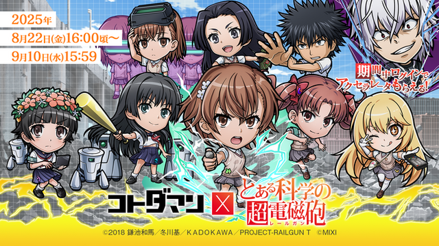 株式会社MIXI(東京都渋谷区、代表取締役社長 上級執行役員 CEO:木村 弘毅)は、スマホアプリの「ことば」で闘う新感覚RPG「共闘ことばRPG コトダマン」(以下コトダマン)において、TVアニメ『とある科学の超電磁砲』との初コラボを、本年8月22日(金)より開催します。