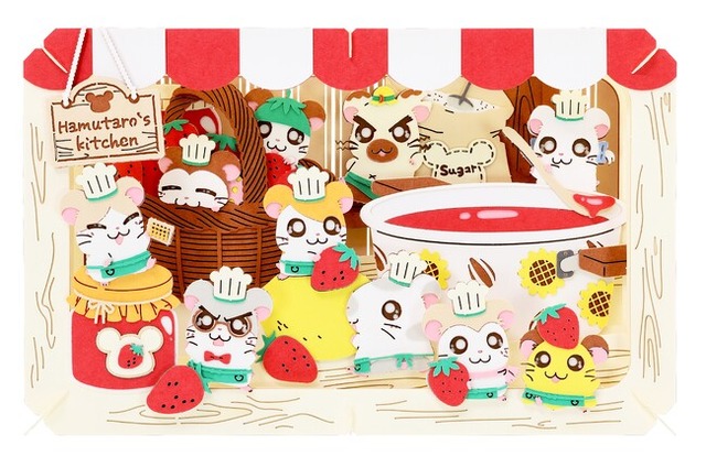 「PAPER THEATER」シリーズに、にぎやかなジャム作りの様子を描いたとっとこハム太郎の新商品が登場します。ハムちゃんずがコック帽やおそろいのエプロン姿で、楽しくジャム作りをしている様子の描き起こしイラストが立体的に表現されています。苺を運んでいるハム太朗や、かごの中で苺のヘタをかぶった“かぶるくん”など、癒しポイントがたっぷり。他のハムちゃんずも何をしているか想像しながら作ってみてください。