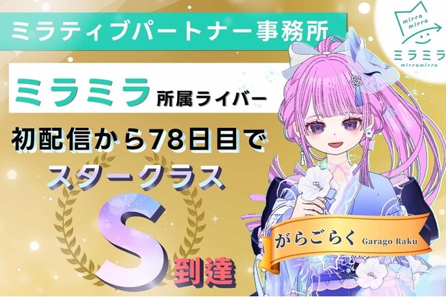 OTAGROUP株式会社(代表取締役:下西 竜二)はスマホ画面共有型ゲーム配信プラットフォーム「Mirrativ」パートナー事務所「ミラミラ」に所属するライバー「がらご らく」が初配信から78日目でスタークラスSに到達したことをお知らせいたします。