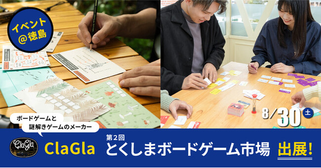 札幌市にあるボードゲーム・謎解きゲームのメーカーClaGla(株式会社クラグラ)は、2025年8月30日(土)に行われる第2回とくしまボードゲーム市場【B-2 ClaGlaブース】にて、各種ボードゲームをイベント特別価格で販売いたします!