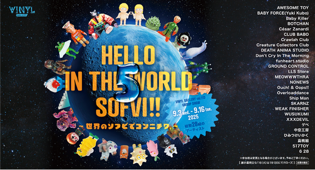 株式会社ケンエレファント(本社:東京都千代田区、代表取締役社長:石山 健三)は、JR東京駅改札内・グランスタ東京にて運営する「VINYL」にて、国内外のアーティストによるソフビ立体作品を集めた展示『HELLO IN THE WORLD SOFVI!! 5 ~世界のソフビでコンニチワ。~』を、2025年9月3日(水)~9月16日(火)の会期にて開催いたします。