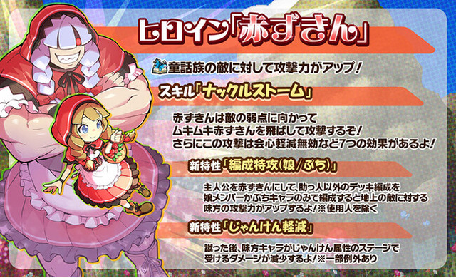 また、「赤ずきん」は2つの新たな特性を持っています。1つは「編成特攻(娘/ぷち)」で、娘メンバーまたはぷちキャラのみでデッキ編成すると地上の敵に対して攻撃力がアップします。もう1つは「じゃんけん軽減」という特性で、姫が蹴った後、味方キャラがじゃんけん属性のステージで受けるダメージが減少します。