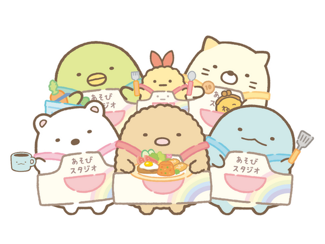 さらに、あそびスタジオ限定てのりぬいぐるみに、新たに「えびふらいのしっぽ」が仲間入り。「えびふらいのしっぽ」はオリジナルアート同様、デザイン違いのエプロンを着用しています。施設内ではすみっコたちとおそろいのエプロンを着て、ごっこ遊びを楽しむことができます。