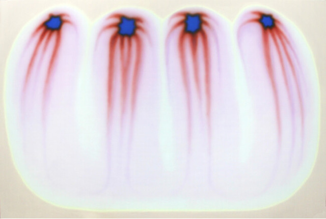 デジタルの手法で作られた特定のモチーフを持たないイメージは、自然にある植物や、かたちのない音楽や宇宙といったものを想起させながら、その正体は分からないまま観る者に不定形なかたちと色彩のインパクトを与えます。何かのように見えるが何物でもないように、一見、デジタルイメージを出力したかのように思える作品もまた、手を動かして緻密に描いたものです。