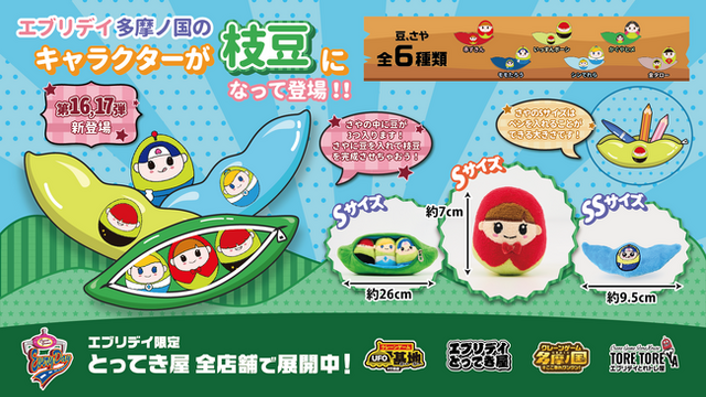 Sサイズは、さや部分がファスナー付きで開閉でき、ぬいぐるみとして楽しむだけでなく、筆箱としても使える実用的なデザイン。さやとは別に展開される豆は、「多摩ノ国」で活躍するキャラクターたちが可愛らしく変身した姿になっており、コレクション性も抜群です。
