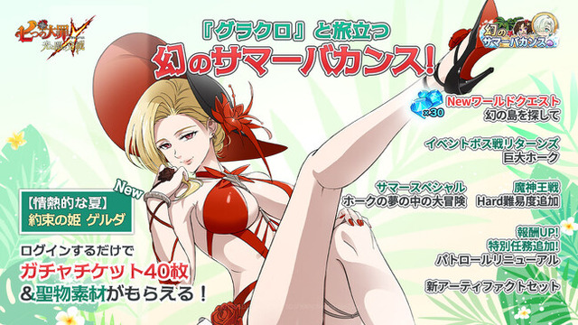 ネットマーブルは、スマートフォン向けシネマティックアドベンチャーRPG『七つの大罪 ~光と闇の交戦(ひかりとやみのグランドクロス)~』(略称:グラクロ)において、8月28日(木)に、新キャラ【情熱的な夏】約束の姫 ゲルダが登場する「幻のサマーバカンス」を開催することをお知らせいたします。