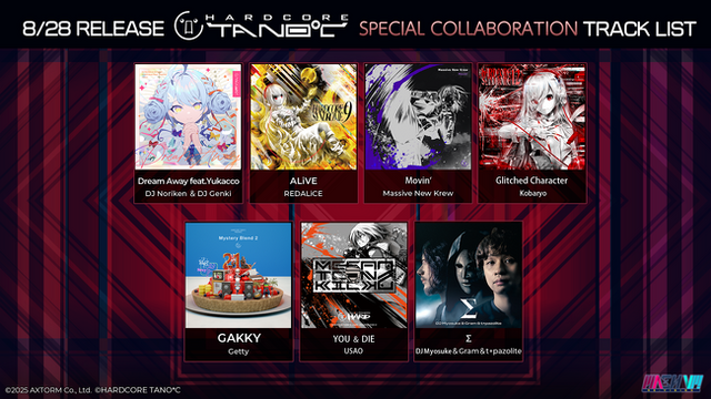 今回のDLCには、「ALiVE / REDALiCE」や「You & DIE / USAO」をはじめ、HARDCORE TANO*Cの人気楽曲を計7曲収録![画像1: https://prcdn.freetls.fastly.net/release_image/149081/9/149081-9-37cda1072dc11d0717e95c1ddd2bc012-1920x1080.png?width=536&quality=85%2C75&format=jpeg&auto=webp&fit=bounds&bg-color=fff ]