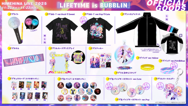 HIMEHINA LIVE 2025『LIFETIME is BUBBLIN』および最新アルバム『Bubblin』の収録曲をイメージした、ライブでお馴染みのTシャツやタオルをはじめ、チェキやトレカを飾れる「バブリルカードディスプレイ」など、全15種のグッズをご用意しました。背面にキービジュアルをあしらった「バブシャカジャケット」と田中ヒメ・鈴木ヒナを泡に閉じ込めた、12色に発光するペンライト「バブライト」は、数量限定販売のため予定数に達し次第終了となります。ご希望の方はお早めにご予約ください。