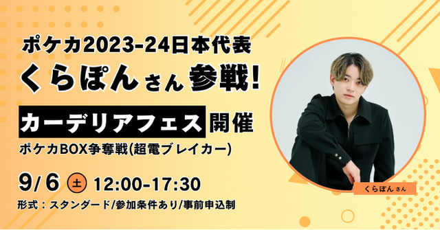 くらぽん選手は、ポケモンワールドチャンピオンシップスで2023年・2024年と2年連続で日本代表を務め、世界最高峰の舞台で活躍する実力派プレイヤーです。2024年にはチャンピオンズリーグ札幌で優勝を果たすなど、国内外で輝かしい実績を残しています。また、自身で「くらぽんカップ」を主催するなど、ポケカコミュニティの発展にも貢献。プロプレイヤーとして、多くのファンから支持を集めています。今回のイベントでは、トップレベルの実力を持つくらぽん選手との対戦機会や交流を通じて、参加者の皆様に楽しんでいただけるイベントを目指します。