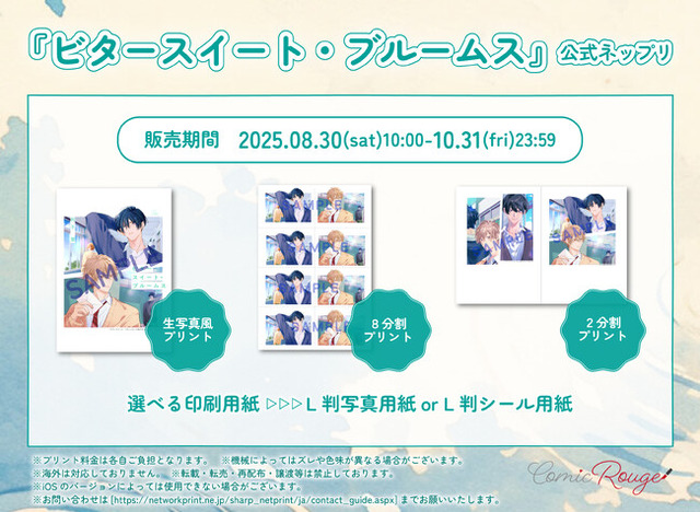 コミックレーベル「コミックRouge」より発売中の『ビタースイート・ブルームス』のカバーイラスト/キービジュアルが、2025年8月30日(土)AM10:00~10月31日(金)までの期間限定で、プリント支援サービス「公式ネップリ」にてL版サイズでプリントできるコンテンツを販売いたします!