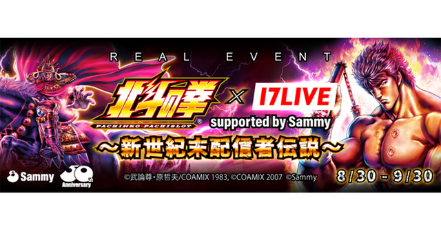 17LIVE株式会社(東京都渋谷区、代表取締役:ジャン・ホンフイ、URL:https://jp.17.live/)が運営する日本最大級のライブ配信アプリ「17LIVE(イチナナ)」は、40年以上もの長い間多くの方に愛され続けている「北斗の拳」とコラボレーションしたイベント『パチンコ・パチスロ 北斗の拳×17LIVE supported by Sammy ~新世紀末配信者伝説~』を、2025年8月30日(土)より開催することが決定しましたので、お知らせいたします。