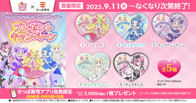 ・内容:期間中、お会計税込3,000円以上ご利用いただき、レジにてかっぱ寿司公式アプリ内の「バーコード付引換券」をご提示いただいたお客様に、かっぱ寿司限定の「キミとアイドルプリキュア♪ ハートクリアコースター」を お会計税込3,000円毎に1枚プレゼントいたします。