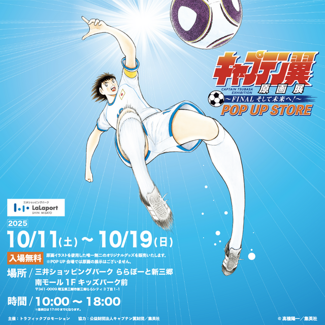 三井不動産商業マネジメント株式会社(所在:東京都中央区 代表取締役社長 大林修)が運営する三井ショッピングパークららぽーと新三郷は、2025年10月11日(土)~10月19日(日)に「キャプテン翼原画展~FINAL そして未来へ!~ POP UP STORE」を開催いたします。